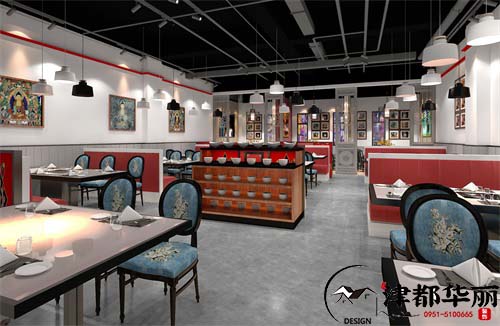 整體空間設(shè)計(jì)充滿了濃郁的地域風(fēng)情,色彩搭配用了紅藍(lán)白,潔白的墻面給人的感覺就是自然純凈,藍(lán)白的桌椅像草原上的天空般蔚藍(lán)清澈,紅色代表了藏族人以及老板熱情待客的豪爽性格,搭配地域元素的飾品、畫作的裝飾,使空間更具有特色。在這里,不僅有不同的舌尖美味享受,還能讓人有身臨其境藏族風(fēng)情的空間體驗(yàn)。